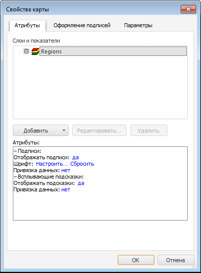 Настройка слоя карты выполняется на вкладке «Атрибуты» в диалоге «Свойства карты».