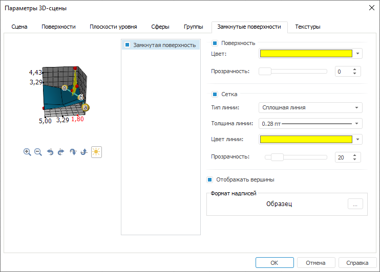 Примечание. Вкладка присутствует в окне «Параметры 3D-сцены», если в источниках данных был создан ряд типа «Замкнутая поверхность».