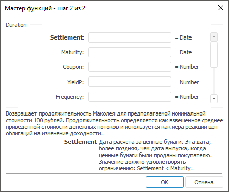 Возвращает продолжительность Маколея для предполагаемой номинальной стоимости 100 рублей.