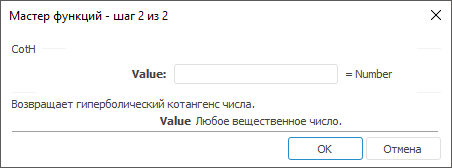 Value. Угол в радианах, гиперболический котангенс которого требуется вычислить. Гиперболический котангенс имеет точку разрыва 0о.