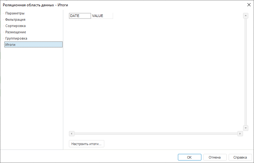 Для настройки итогов реляционной области данных перейдите на вкладку «Итоги» окна «Реляционная область данных»: