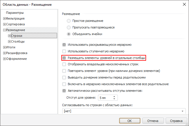 2. В открывшемся окне «Свойства области данных» перейдите на вкладку «Размещение > Строки > Измерение».