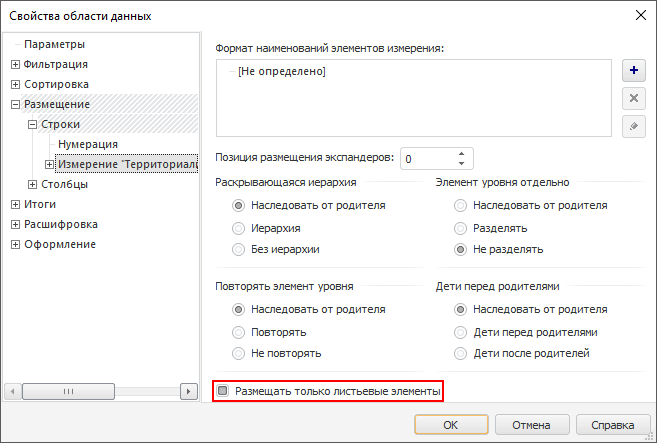 3. Выберите измерение «Территориальные измерения» и установите для него флажок «Размещать только листьевые элементы»: