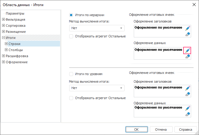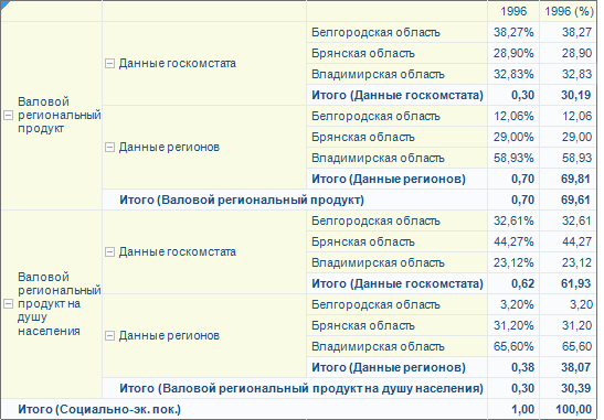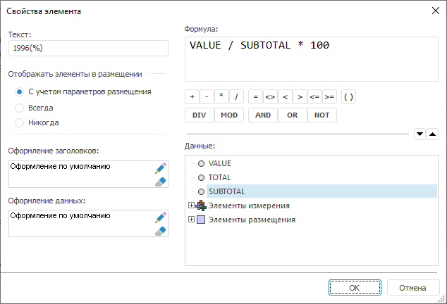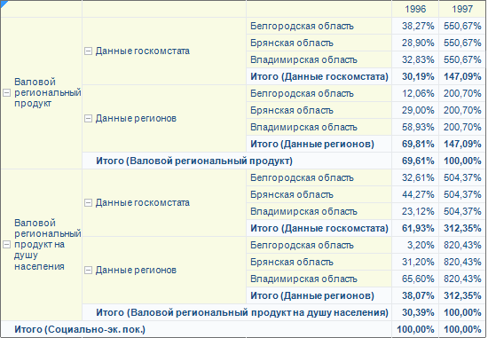 Для любой области данных можно настроить вывод итоговых значений. Иногда требуется отображение не самого значения ячейки, а его доли в процентах к промежуточному итогу по соответствующему уровню, либо общему итогу. Такой расчет может быть настроен только для отдельных столбцов/строк и при размещении нескольких измерений по строкам/столбцам. Для наглядности можно произвести настройку так, что некоторые столбцы/строки будут отображать абсолютные значения, а некоторые долю в процентах.