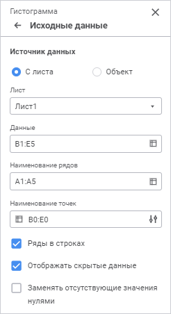 При создании диаграммы группа параметров «Исходные данные» открывается автоматически.