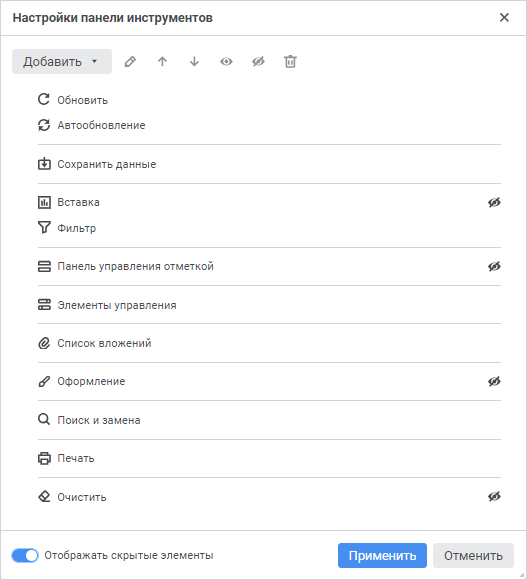 Отображать скрытые элементы. Активируйте переключатель «Отображать скрытые элементы» для отображения всех элементов панели инструментов. По умолчанию переключатель активен;