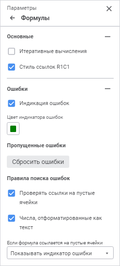 Для определения параметров расчета формул с циклическими ссылками и стиля ссылок перейдите на вкладку «Формулы» панели «Параметры».