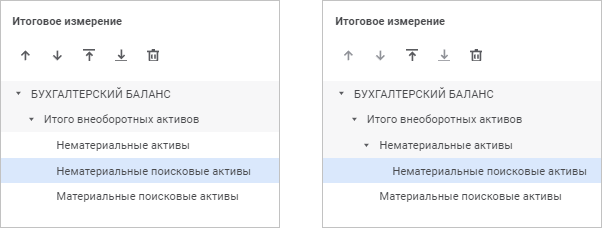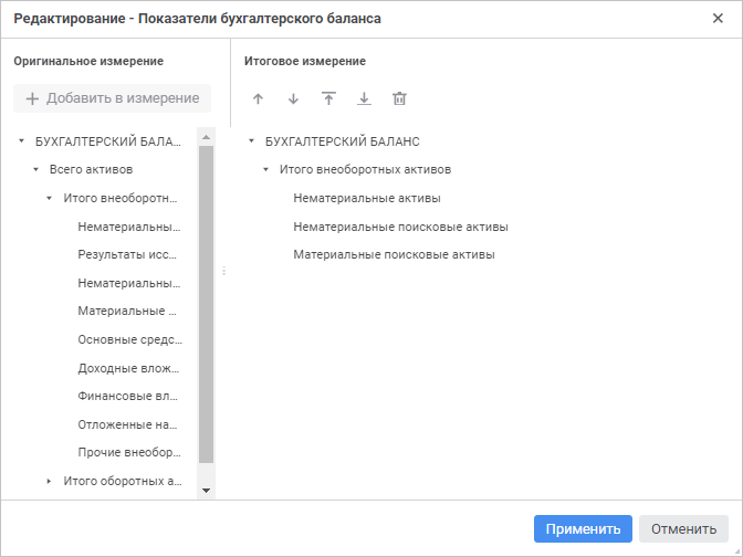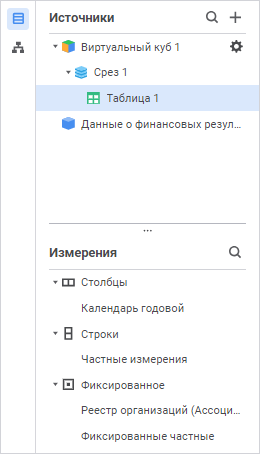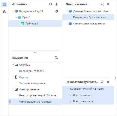 Панель «Фиксированные частные» содержит список зафиксированных частных измерений с их принадлежностью к источнику данных.
