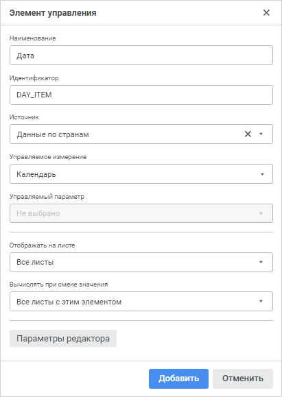 Управляемое измерение. Из раскрывающегося списка выберите измерение, которым будет управлять элемент управления. Поле доступно после выбора источника;