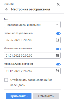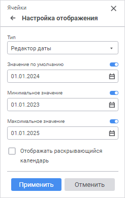 Отображать раскрывающийся календарь. Установите флажок для отображения кнопки открытия календаря для визуального выбора даты в редакторе.
