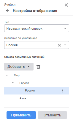 Редактор отображает набор возможных значений в виде иерархического списка: