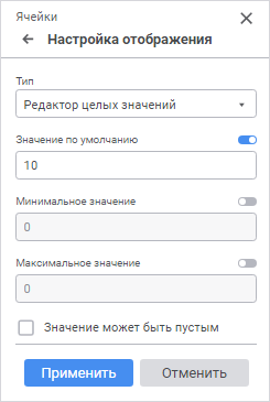 Значение по умолчанию. Активируйте поле, используя переключатель, и определите значение, которое будет отображаться в редакторе по умолчанию. Данное значение должно быть в диапазоне допустимых значений, заданных для редактора. Если диапазон допустимых значений для редактора не задан, то значение должно быть в диапазоне [-2147483648; 2147483647];