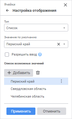 Разрешить ввод. При установленном флажке в поле редактора можно ввести значение, которое отсутствует в раскрывающемся списке;