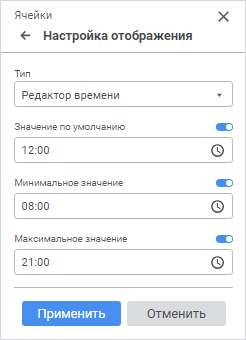 Значение по умолчанию. Активируйте поле, используя переключатель, и определите значение времени, которое будет отображаться в редакторе по умолчанию. Значение должно быть в диапазоне допустимых значений, заданных для редактора. Если диапазон допустимых значений для редактора не задан, то значение должно быть в диапазоне от 0:00 до 23:59;