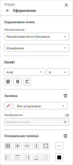 Уголок. Доступны настройки: содержимое ячеек, шрифт, заливка и специальная граница;