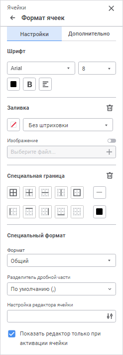 Настройки. Настройки оформления ячеек: шрифт, заливка, специальная граница, специальный формат;