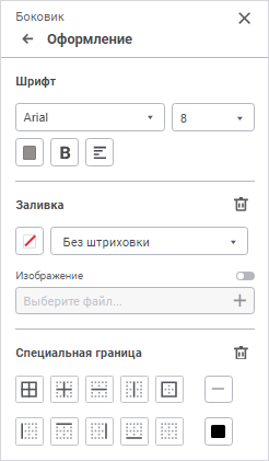 Данные. Доступны настройки: шрифт, заливка, специальная граница, прочее;