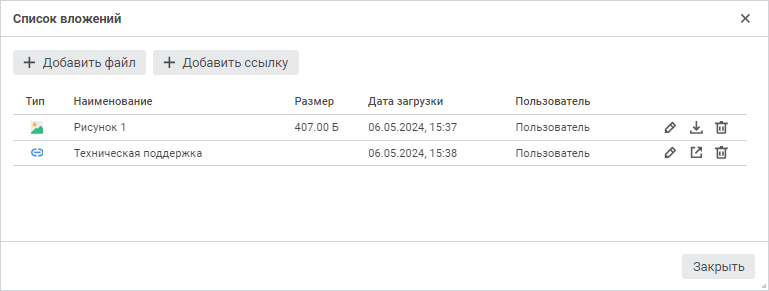Для пояснения данных в ячейке таблицы доступно прикрепление вложений в виде файлов или ссылок. Для прикрепления вложений используйте окно «Список вложений»: