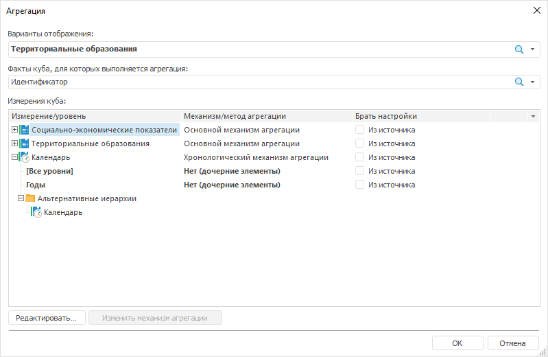 Агрегация по уровням пользовательской и альтернативной иерархии настраивается: