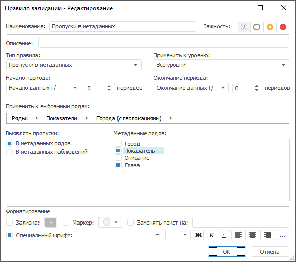 2. Укажите тип метаданных, в которых выявляются пропуски: метаданные временных рядов или метаданные наблюдений. Установите соответствующий переключатель в группе «Выявлять пропуски».