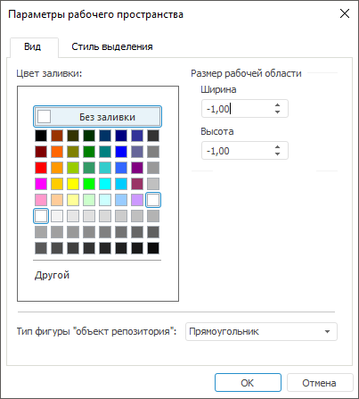 Вид. На вкладке настраиваются цвет заливки, тип фигуры и размер рабочей области;