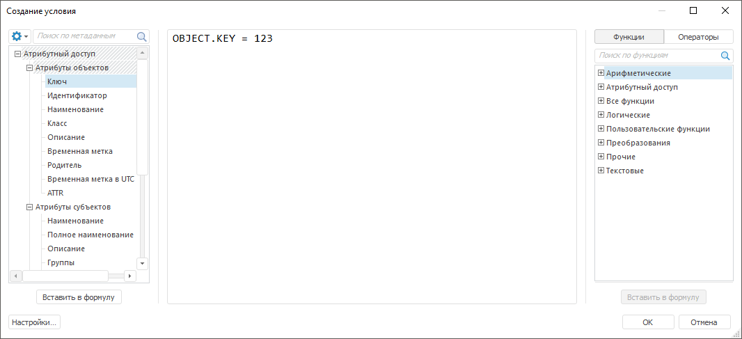 Задайте дополнительное условие проверки доступа в виде логического выражения. Для формирования выражения используйте атрибуты (операнды), функции и операторы.