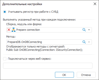 После выполнения одного из действий раскрыт набор параметров «Дополнительные настройки» в веб-приложении или будет открыто окно «Дополнительные настройки» в настольном приложении. Набор параметров зависит от выбранного типа клиента СУБД, который используется для подключения к базе данных: