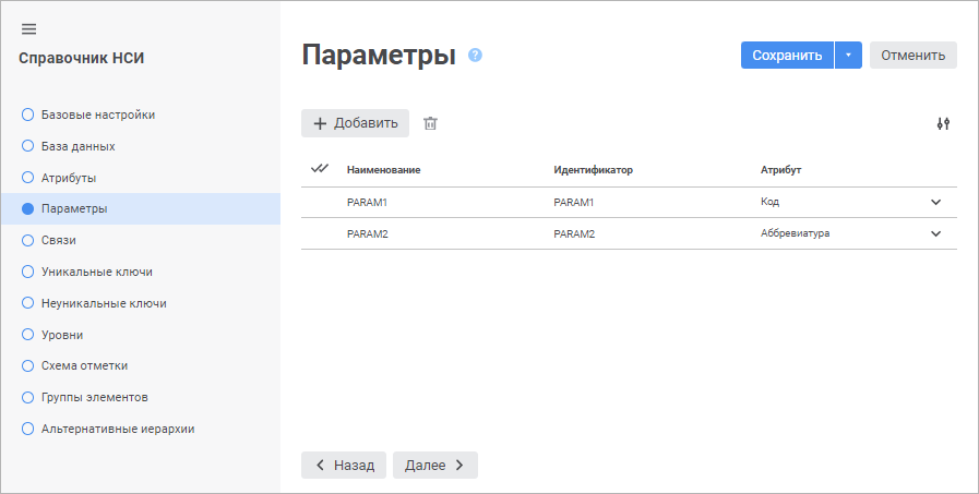 Для создания и настройки параметров справочника НСИ перейдите на страницу «Параметры» мастера справочника.