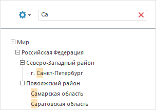 В строку поиска введите искомый текст. Элементы, в которых встречается заданная подстрока, будут выведены в дереве элементов с их родительскими и дочерними элементами: