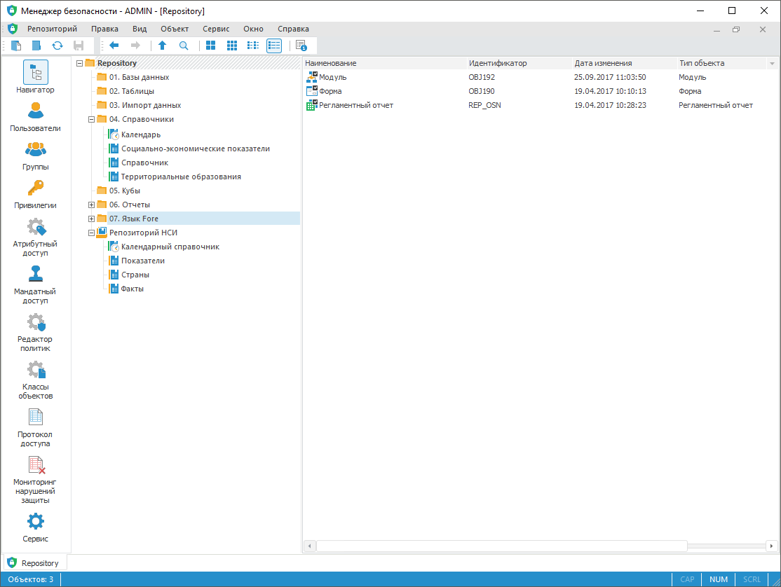 Для настройки прав доступа к объектам используйте раздел «Навигатор» панели навигации.