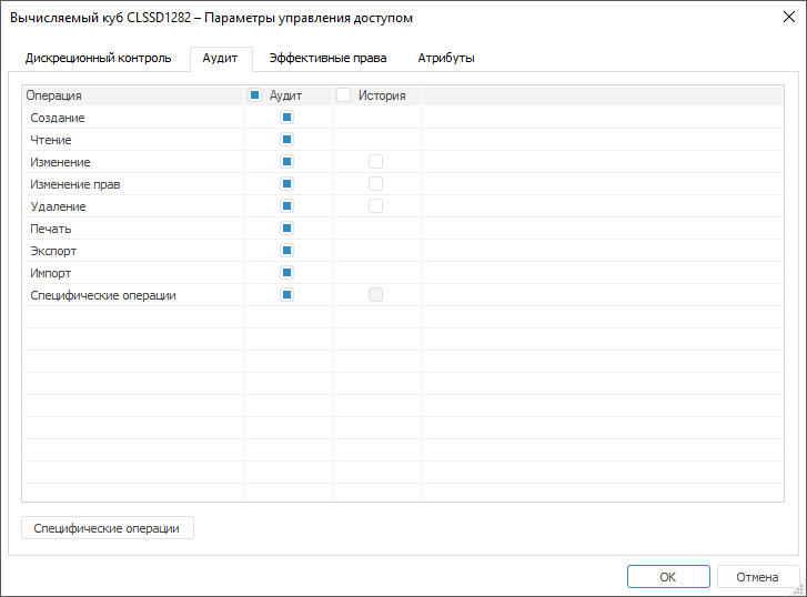В списке общих операций содержится строка и кнопка «Специфические операции»/«Показать специфические операции», которая определяет настройку аудита по специфическим операциям.