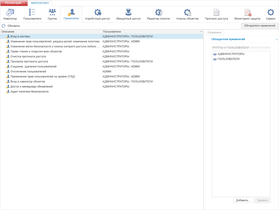 Примечание. При разделении ролей между администратором информационной безопасности и прикладным администратором раздел «Привилегии» будет доступен только администратору информационной безопасности.
