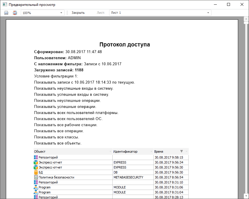 Для предварительного просмотра и печати в протоколе доступа учитывайте настроенное отображение столбцов и используемую фильтрацию в таблице.