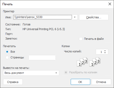 После выполнения одного из действий будет открыто стандартное окно печати. Выберите параметры печати, используемый принтер и нажмите кнопку «ОК».