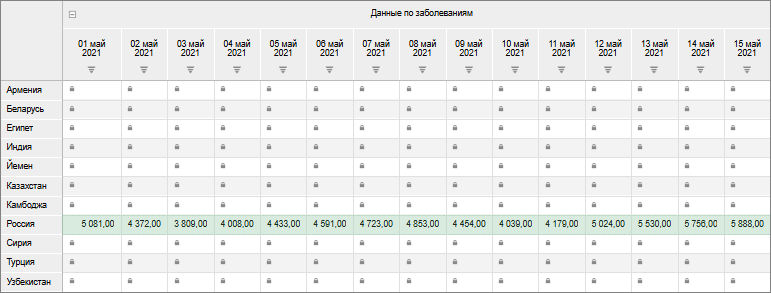 подсветка данных отобразится в табличной области формы ввода для экземпляра процесса, содержащего в отметке параметров по одному элементу. Например, экземпляр процесса «Факты - Выздоровлений за день; Пол - Женщины»:
