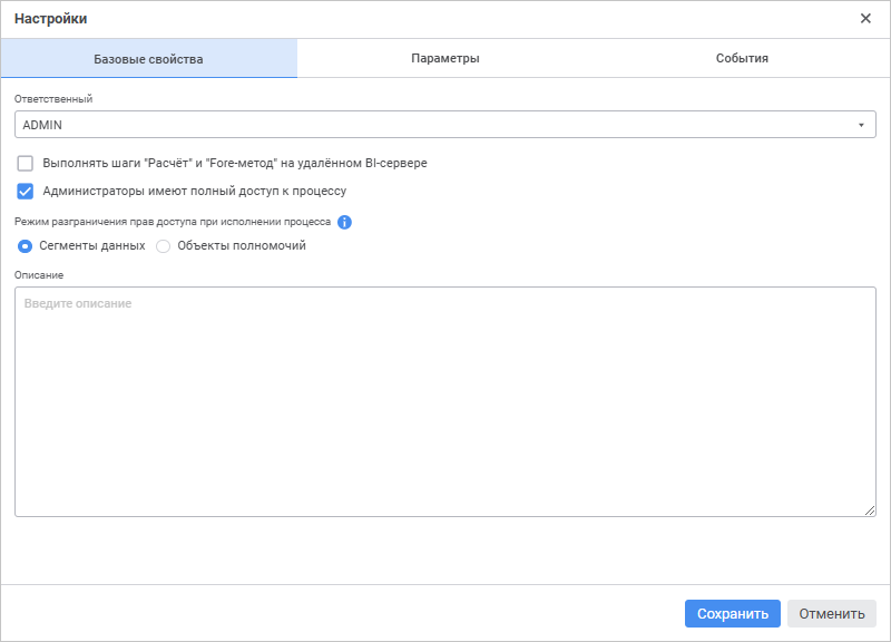 Настройка базовых свойств процесса выполняется на вкладке «Базовые свойства» окна «Настройки»: