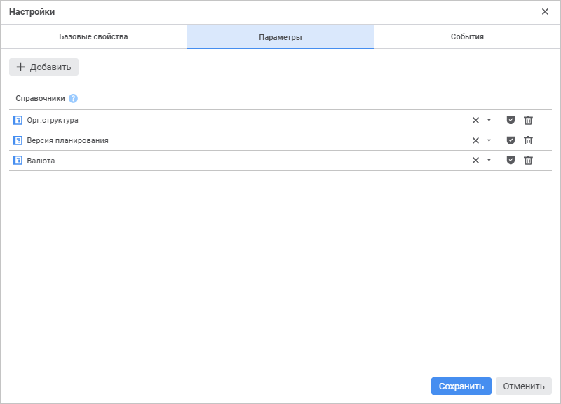 Сформируйте параметры процесса из справочников, которые будут использоваться в качестве параметров. Доступные операции: