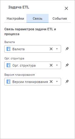 Для выполнения задачи ETL с теми же параметрами, что и запущенный шаг процесса, выполните настройку связи задачи ETL и процесса на вкладке «Связь» панели параметров шага:
