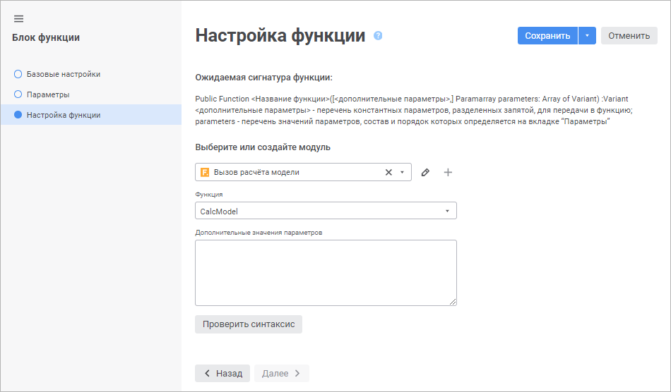 Примечание. Если дополнительные параметры не заданы в сигнатуре функции, но заданы на странице «Настройка функции» в мастере редактирования блока функции, то они будут содержаться перед значениями параметров блока в переменной parameters.