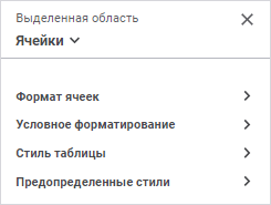 для ячеек доступны группы параметров «Формат ячеек», «Условное форматирование», «Стиль таблицы» и «Предопределённые стили»;