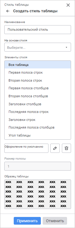 Стиль таблицы. Позволяет применить стандартный или пользовательский стиль в виде таблицы с чередующимся оформлением строк/столбцов;