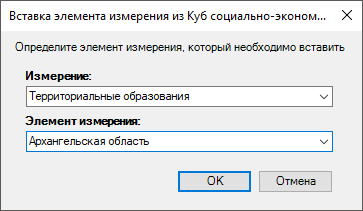 В окне «Вставка элемента измерения из <Наименование источника>» выберите измерение и элемент измерения в соответствующих полях и нажмите кнопку «OK»: