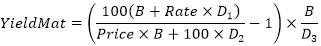 YieldMat(Settlement: DateTime; Maturity: DateTime; Issue: DateTime; Rate: Double; Price: Double; [Basis: Integer = 0]): Double;