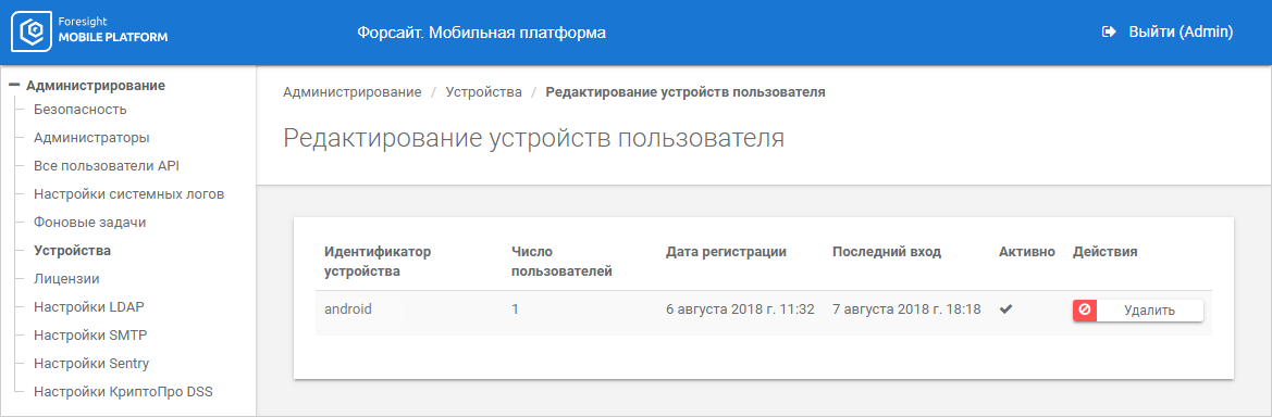 Для удаления привязки выбранного устройства к пользователю нажмите кнопку «Удалить», расположенную напротив идентификатора устройства.