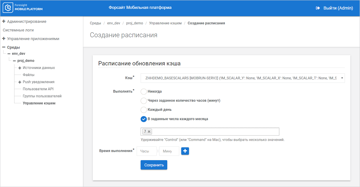 Обновление кэша. Для одного кэша по параметрам может быть задано несколько расписаний обновления. Все расписания задаются отдельно для каждого кэша. Если не задано ни одно расписание, то обновление происходит при запросах на получение данных из ресурсов в случае истекшего срока хранения данных в кэше. Также кэш можно обновить вручную при его просмотре;