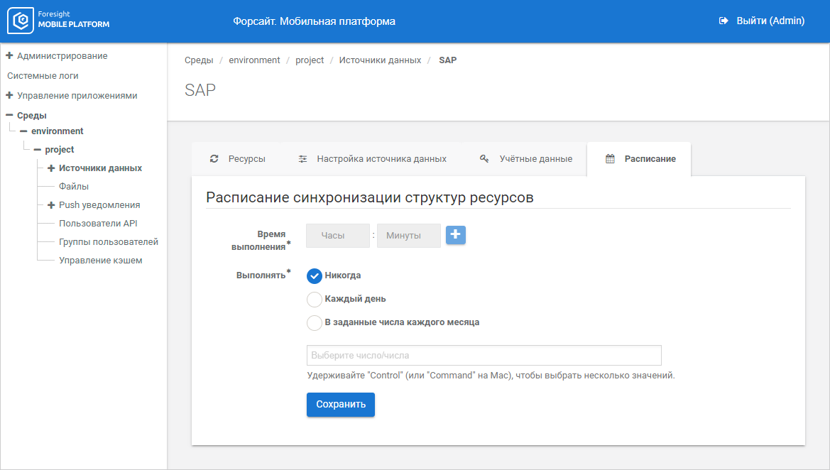 Нажмите кнопку «Сохранить» для сохранения изменений. После выполнения действий будет задано расписание для синхронизации структур ресурсов между сервером мобильной платформы и источником данных.