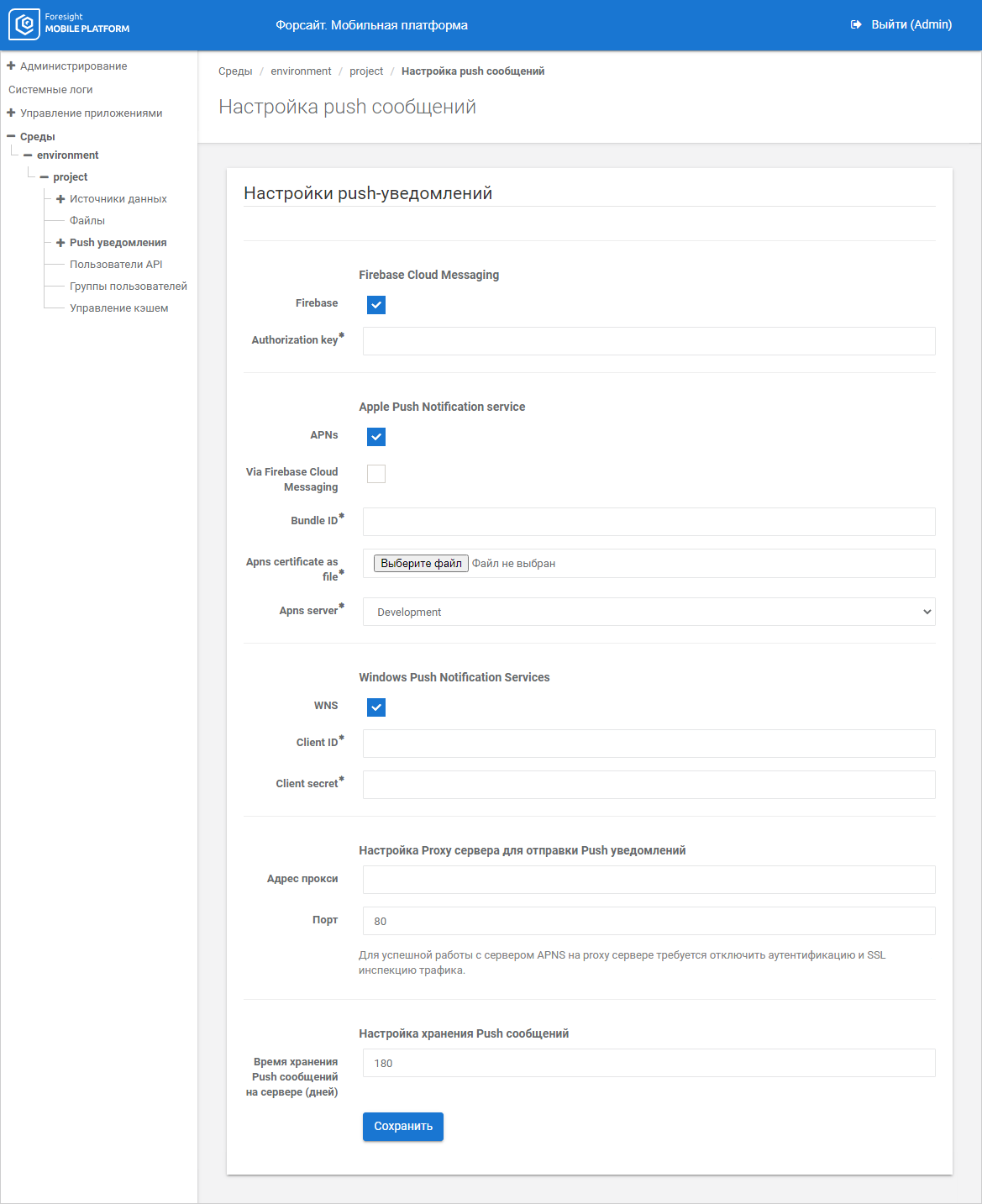 Время хранения Push сообщений на сервере (дней). Укажите время хранения push-сообщений на сервере мобильной платформы в днях. По умолчанию установлено значение «180».