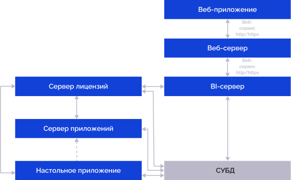 Примечание. Сервер приложений может быть совмещен с BI-сервером. При выполнении ресурсоёмких задач располагайте сервер приложений отдельно от BI-сервера.