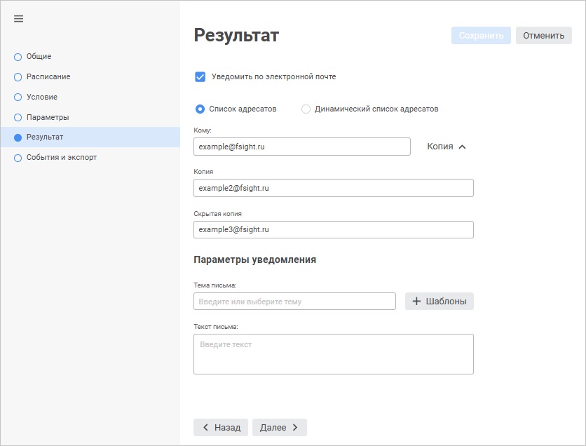 задайте список адресов электронной почты, на которые будет отправлено уведомление. После каждого адреса поставьте точку с запятой;