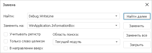 При первом нажатии кнопки «Заменить»/ «Заменить» будет осуществлён поиск первого вхождения искомого текста. В случае удачного поиска курсор будет установлен на найденную строку, а искомый текст в этой строке будет выделен. Дальнейшее нажатие кнопки «Заменить»/ «Заменить» приведёт к замене найденного текста и поиску следующего вхождения.